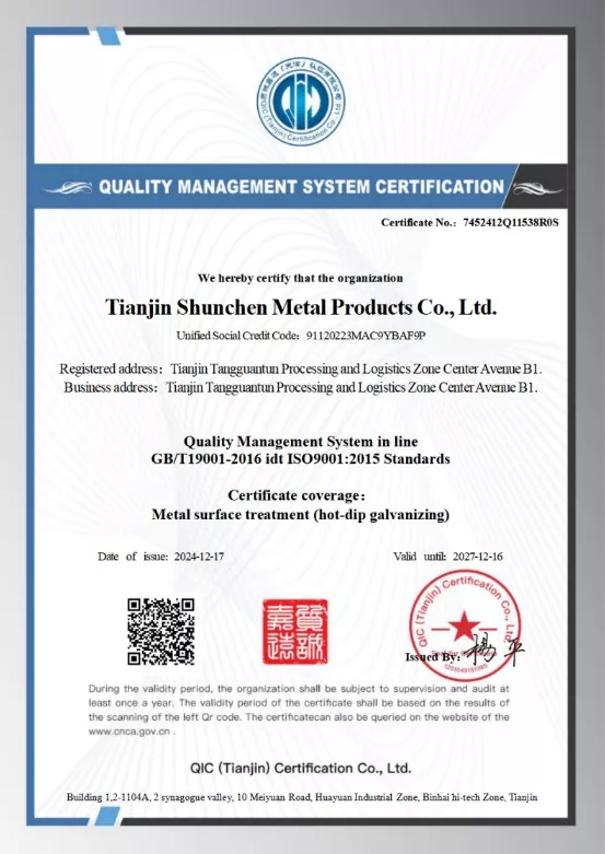 Vyberte si Shunchen pre spoľahlivú kvalitu. Používame vysokokvalitnú oceľ Q235B alebo Q355B, spracovanú žiarovým zinkovaním na odolnosť proti korózii. Teplota zinkovej nádoby je presne kontrolovaná v rozsahu 450-460 stupňov Celzia, aby sa zabezpečila silná priľnavosť zinkového povlaku a žiadne vynechané miesta. Naše výrobky sú v súlade s certifikáciou systému kvality ISO9001 a sú podložené správami o kontrole zinkového povlaku tretích strán.